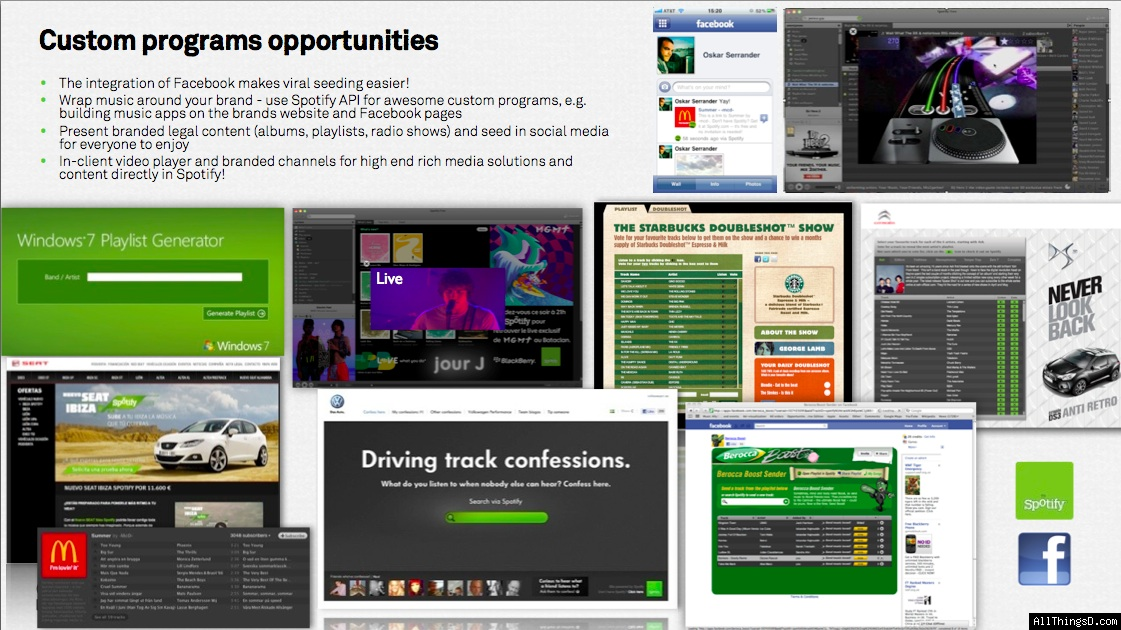 Spotify is playing up its tie-up from Facebook from the very start: It says that at launch, 150 million Facebook users “will start to see music on their feeds. One click and they can have Spotify.” Spotify is also telling advertisers that they’ll be able to use Spotify to build “music apps” on their own sites and on Facebook pages.