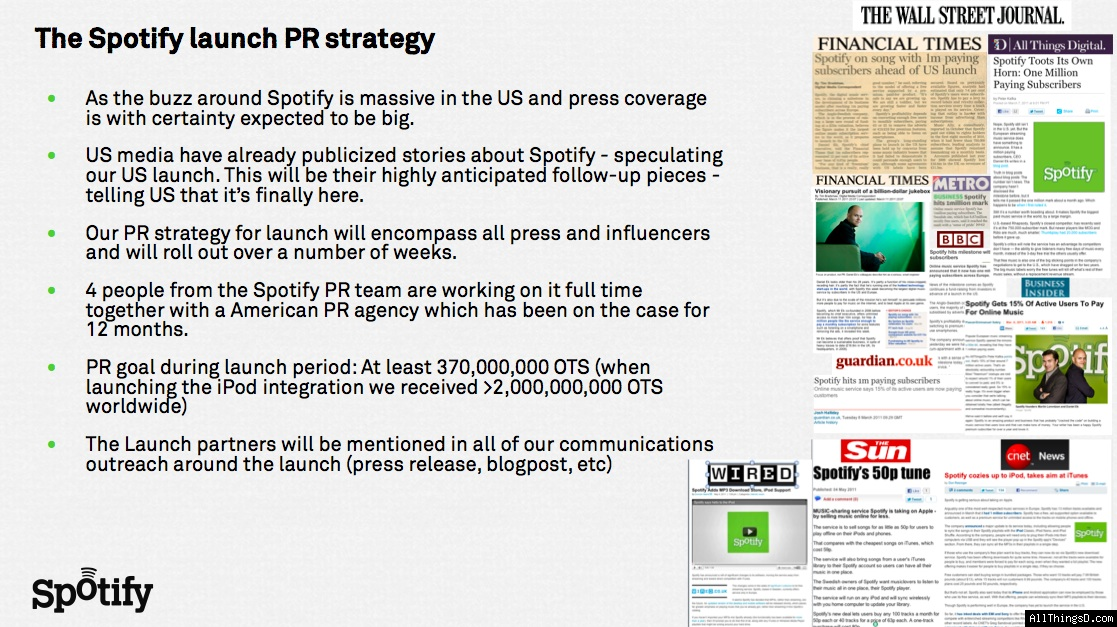 Spotify expects the press to do much of its work, for free. As the company notes, people like myself have already been giving it plenty of publicity in advance of its launch. And that means more to come when it does launch: “press coverage is with certainty expected to be big.” It’s telling advertisers that during launch it expects to generate 370 million “opportunities to see” — a bit of marketingspeak that means what it sounds like, more or less. By comparison, it says that a recent iPod integration generated 2 billion opportunities.