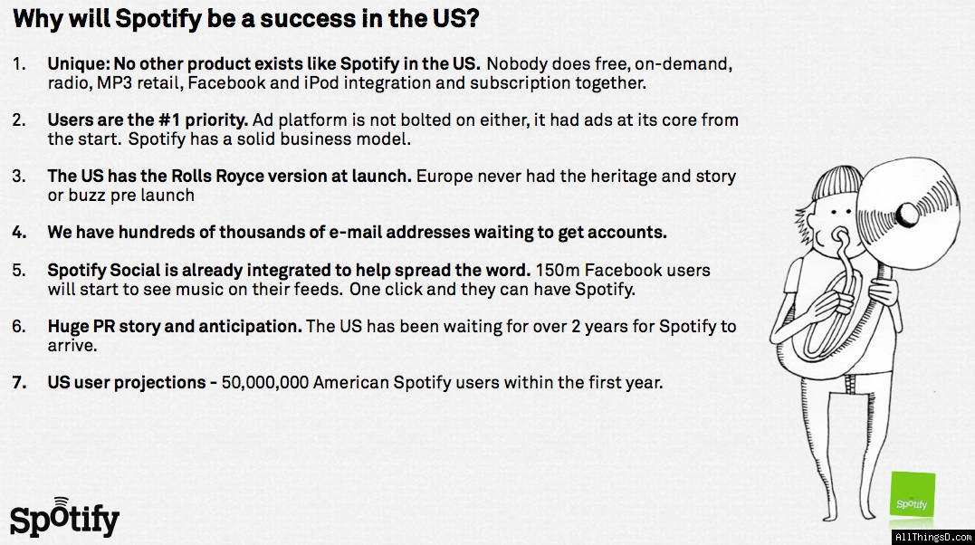 Spotify isn’t thinking small. A slide in the promotional deck projects that the service will have 50 million U.S. users in its first year of operation. That number seems preposterously high — for comparison, note that Spotify recently said it has a million subscribers in Europe after a couple years of operation, and implied that it had 7 million active users. And that makes me think the 50 million figure may be the work of an extra-zealous salesman trying to drum up interest.* Still, even if it’s an off-the-reservation boast instead of an official goal, it gives you a sense of the company’s ambitions. (Both Spotify and Facebook declined to comment for this report.)