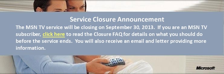 “WebTV (later called MSN TV) started in 1996 with the goal to bring new people ‘online’ and to give those already online an easy, hassle-free means of accessing the internet from the comfort of their homes. Later, MSN TV 2 was released with vastly greater power and features. Since then, the web has continued to evolve at a breathtaking pace, and there are many new ways to access the internet. Accordingly, we have made the difficult decision to end the MSN TV service on September 30th, 2013. We are working with our customers to ensure the transition is as seamless as possible.”