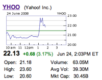 Shares of Yahoo spiked this afternoon on rumors that Yahoo is back in merger or partial acquisition talks with Microsoft. YHOO rose 5.2% to $22.56 in afternoon trading before falling to its knees again after a source close to Microsoft told CNBC there are no new negotiations between the two companies. “There is no deal for the whole company, and nothing has changed as of today,” the source said.